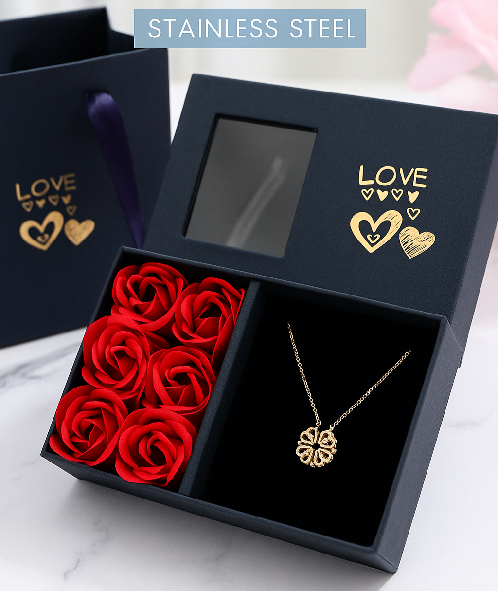 A beautiful expression of love and elegance. This stainless steel necklace features a delicate flower-shaped pendant with sparkling accents, presented in a luxury gift box with four red roses. A perfect gift for birthdays, anniversaries, or any special moment.